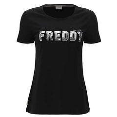T-shirt in morbido jersey di cotone impreziosita dalla grande grafica frontale FREDDY in paillettes argento, perfetta per i tuoi outfit da protagonista con declinazioni glamour.